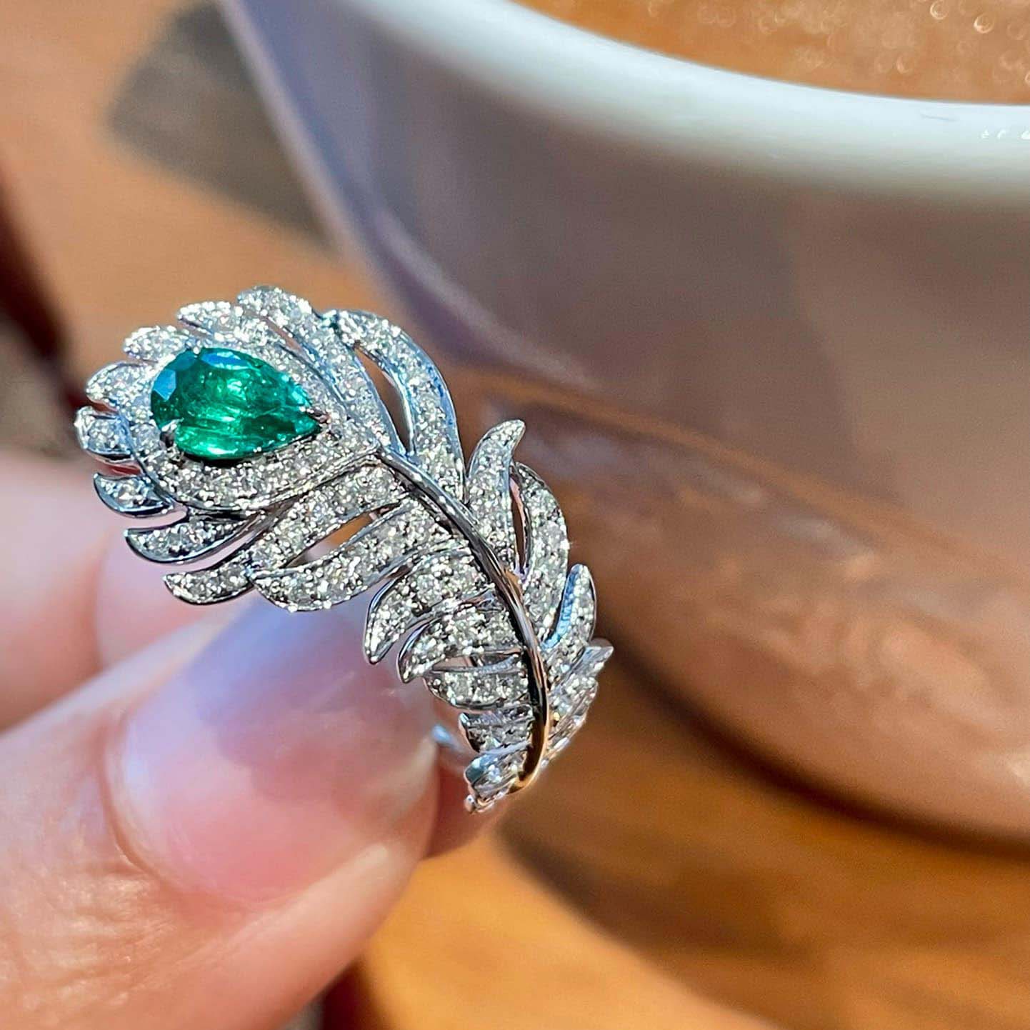 18K天然鑽石-祖母綠羽毛璀璨戒指