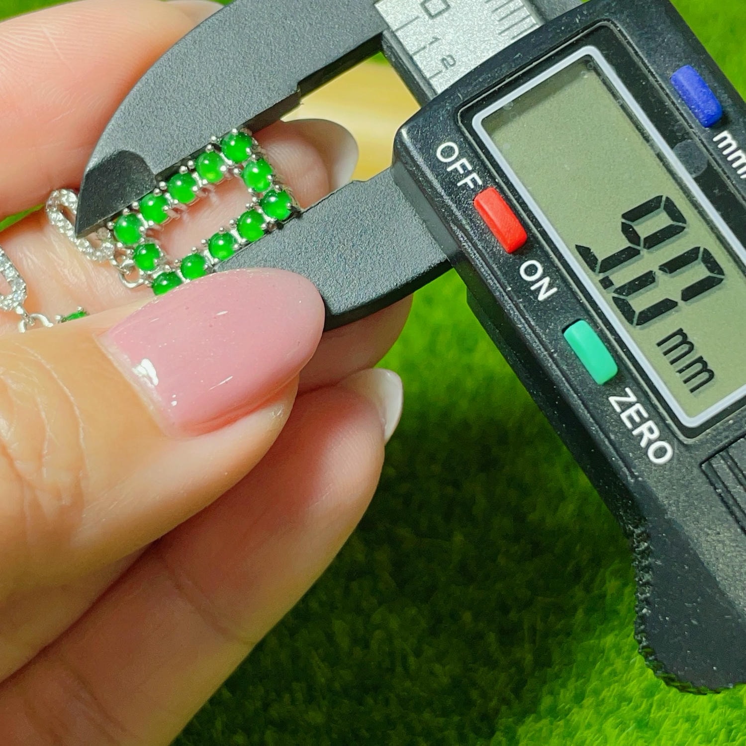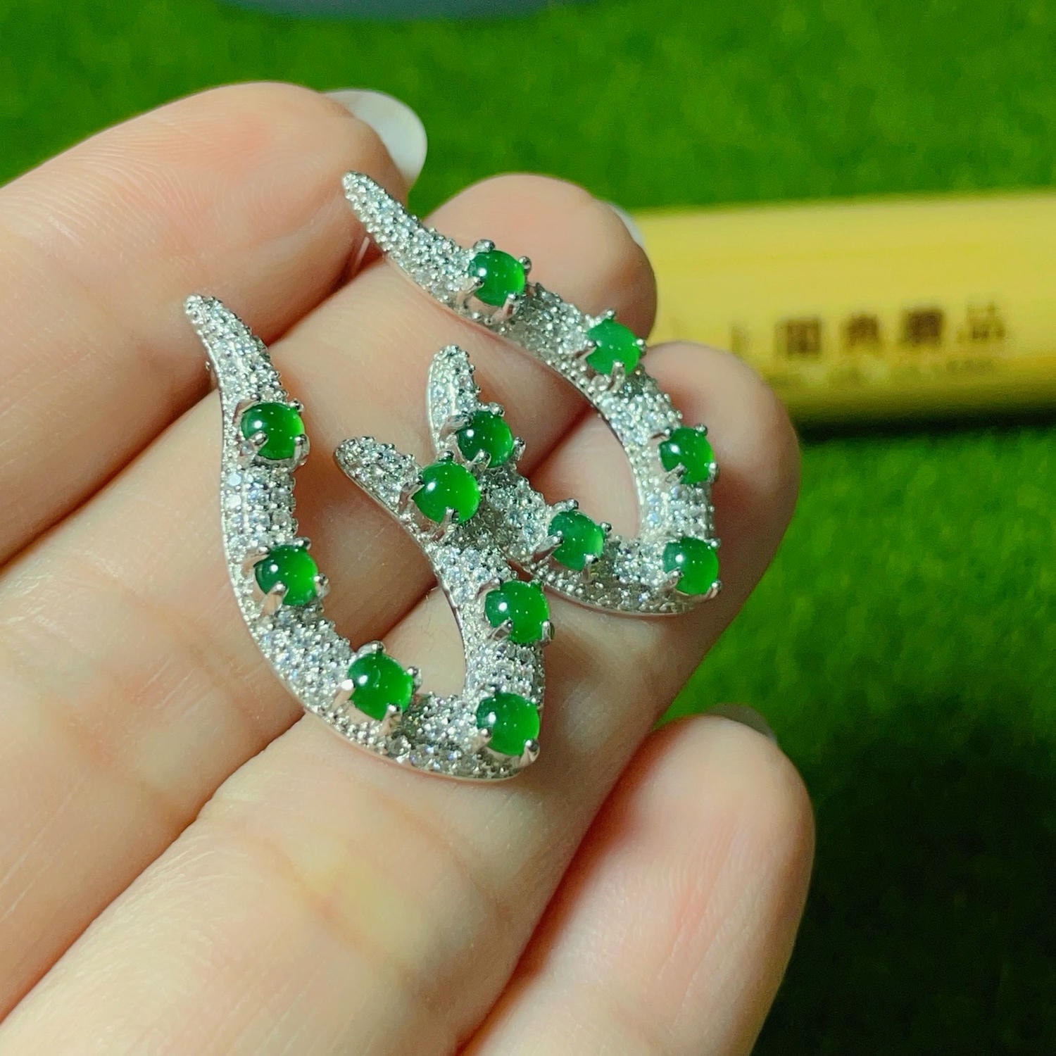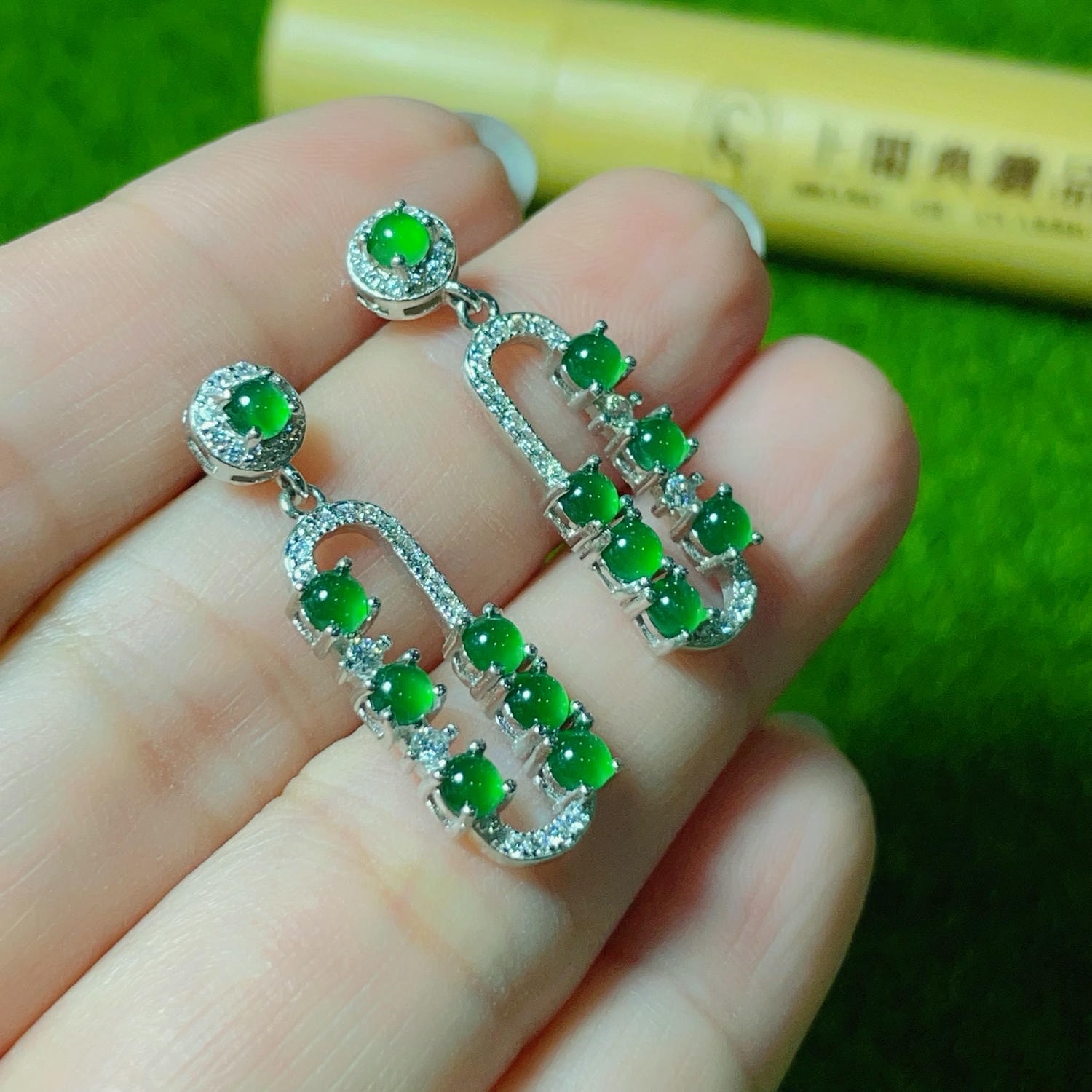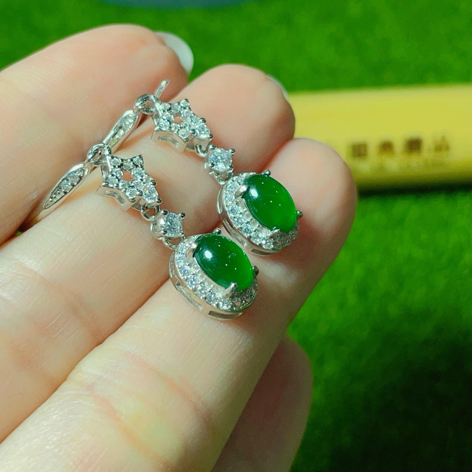 天然翡翠-A貨翡翠放光小蛋面長形耳環